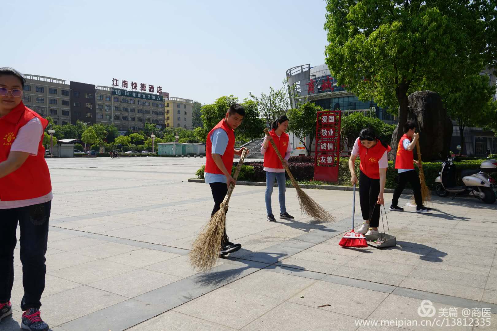 趣味运动会后,青年职工又换上了志愿者服装前往文化体育广场开展“防疫有我 爱卫同行”志愿服务活动。志愿者们不畏酷暑做着各项清洁工作,打扫地面,消杀座椅,清理垃圾。烈日之下,透过一张张满是汗水的脸庞和一个个被汗水浸透的背影,我们看到了青年朋友用实际行动传承志愿精神的炙热与激情!正是这一抹抹志愿红,坚守着我奉献我快乐的服务精神,为文明城市建设贡献着青春和汗水!